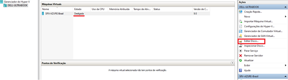 Para fazer isso, primeiro temos que dar um shutdown na VM, com a VM desligada vamos no gerenciador do Hyper-V e vamos clicar em “Editar Disco”: