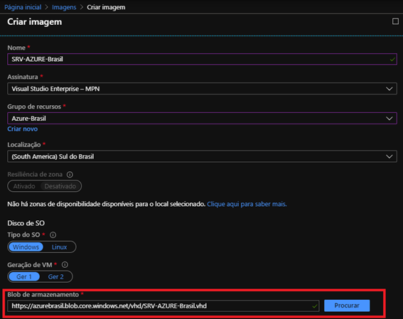Na opção Blob de armazenamento, vamos clicar em procurar e navegar até nosso VHD e depois clicar em criar imagem. Após o a execução aparecerá a imagem pronta: