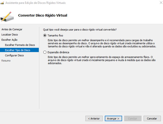 E o tipo de disco vamos selecionar “Tamanho Fixo”: