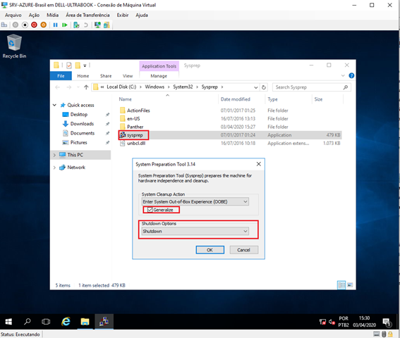 Vamos executar o sysprep.exe na pasta que aparecer, lá vamos marcar a opção Generalize e mandar desligar a máquina: