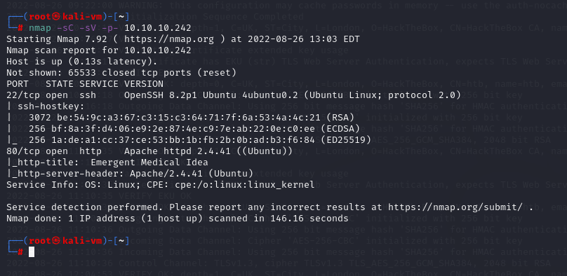 Comecei com aquele básico scaneamento de portas com nmap. Encontradas as portas 22(SSH) e 80(HTTP) abertas.