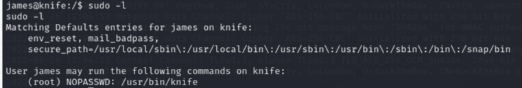 Para realizar a escalação do privilégio, dessa vez procurei manualmente por vulnerabilidades na máquina. E ao utilizar o comando sudo -l, descobri que o knife pode ser utilizado com permissões sudo, sem necessitar de senha.