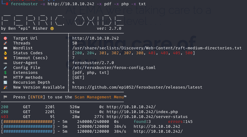 Realizei a busca por diretórios e arquivos utilizando a ferramenta feroxbuster e descobri apenas o arquivo index.php, o que não foi muito relevante. Então resolvi procurar outras formas de comprometer a máquina.