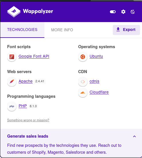 Com o uso do Add-on do Mozilla Wappalyzer, enumerei as tecnologias utilizadas pela aplicação. A linguagem de programação utilizada é a PHP versão 8.1.0, descobrir essa informação vai me ajudar nos próximos testes.