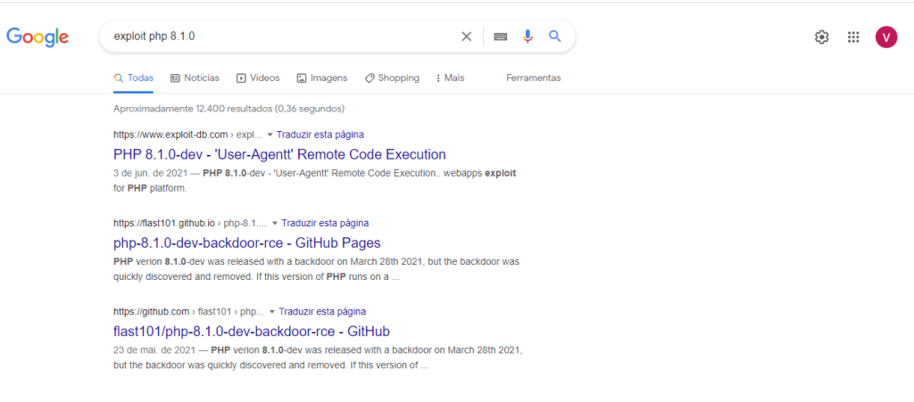 Lembra da versão do PHP encontrada com o Wappalyzer? Com uma breve pesquisa do google consegui encontrar vulnerabilidades para ela, o que vai me ajudar nos próximos passos.
