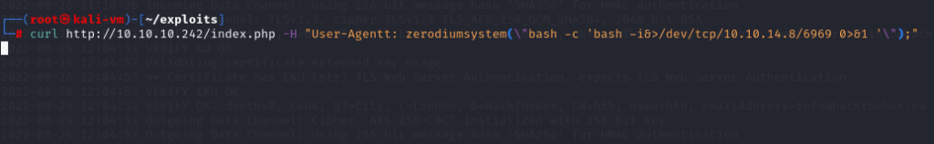 Ao ler sobre o a vulnerabilidade descobri que existe um backdoor para essa versão do PHP que nos possibilita executar um código remoto através da manipulação do header do User-Agent. Como todo exploit, existem diferentes formas da vulnerabilidade ser explorada, após alguma pesquisa e alguns testes resolvi utilizar o curl para fazer um shell reverso.