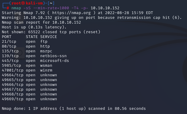 Primeiramente comecei com o scaneamento de porta. Dessa vez precisei dar uma modificada no rate do nmap para melhor desempenho do scaneamento.