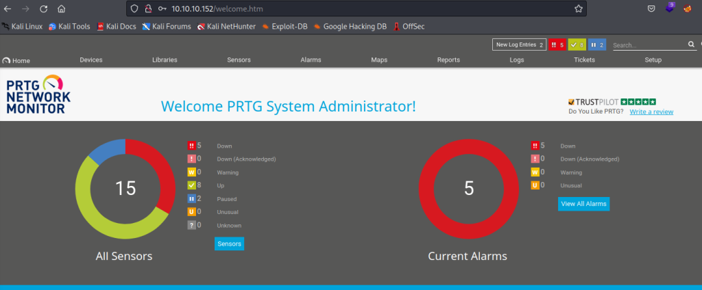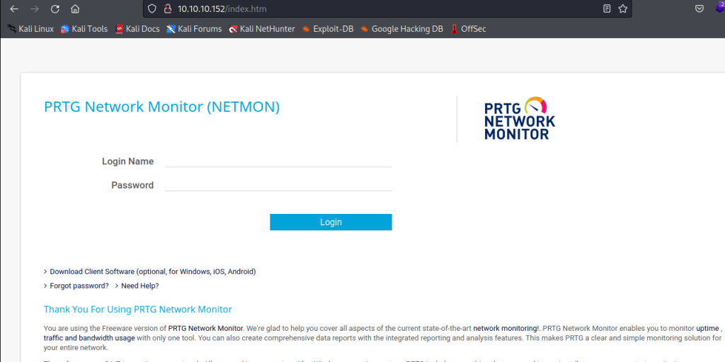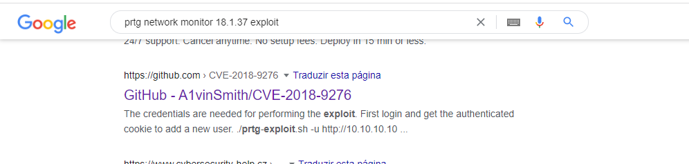 Como podem ver a aplicação web é a PRTG Network Monitor. Quando a aplicação web se trata de uma aplicação de mercado e conhecida, o primeiro passo que dou é pesquisar por exploits já conhecidos para aplicação. Porém ainda não tenho nem a versão do PRTG, o que torna a pesquisa por exploits mais complicada… Testar todos os exploits encontrados na internet demoraria muito.