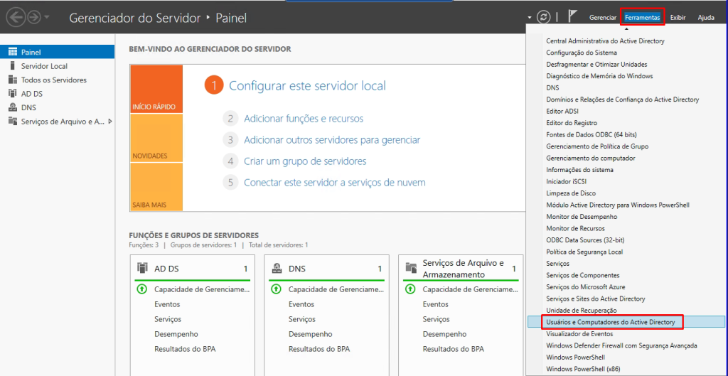 O primeiro passo a ser dado, é acessar as Ferramentas Administrativas ou o Gerenciador de Servidores, e abrir a ferramenta Usuários e Computadores do Active Directory.