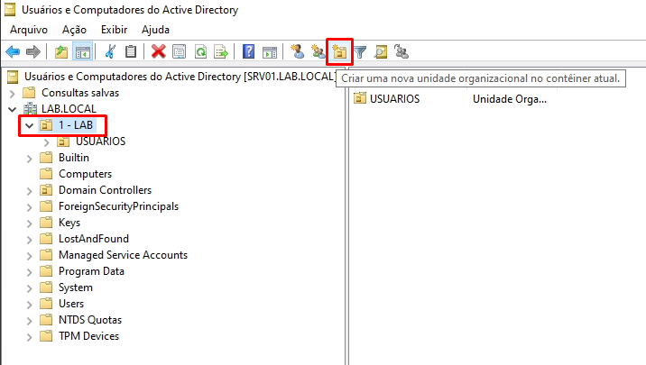 Selecione o local onde a OU ficará (no meu caso, sob a OU 1 – LAB) e clique em “criar uma nova unidade organizacional no contêiner selecionado“.