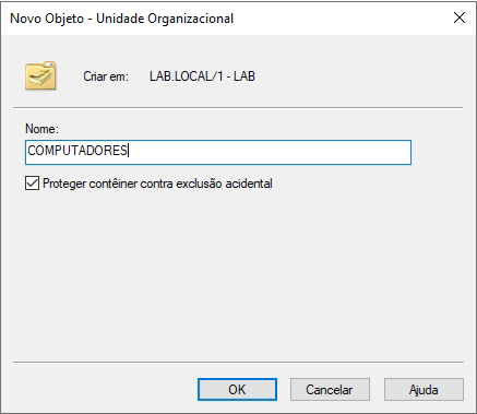 Com a ferramenta aberta, devemos criar a unidade organizacional para onde os computadores serão movidos por padrão.