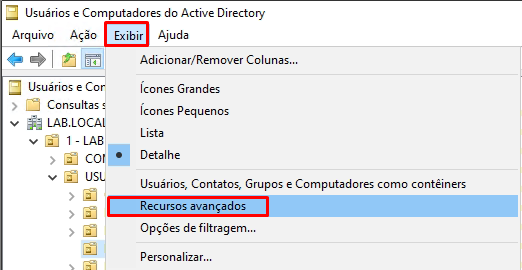 Com a OU criada, clique sobre exibir e marque a opção “recursos avançados”.