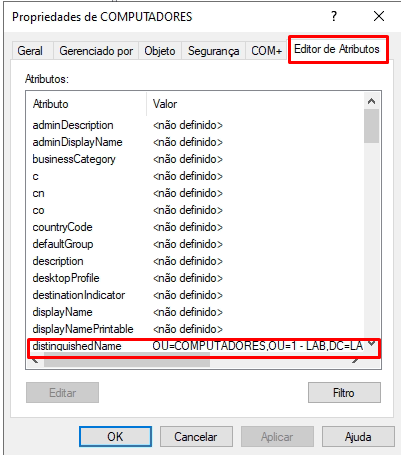 Com a janela aberta, clique em editor de atributos, e procure pela informação DistinguishedName.