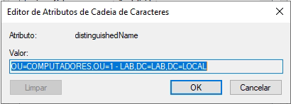 OU=COMPUTADORES é uma unidade organizacional localizada sob a OU principal, OU=1 – LAB, que opr sua vez faz parte do domínio LAB.LOCAL, referenciado por DC=LAB, DC=LOCAL.