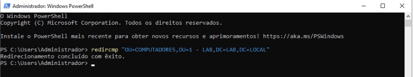 Com o PowerShell aberto, digite o comando redircmp, seguido do DistinguishedName copiado anteriormente, colocando-o sobre aspas, conforme a seguir, no meu caso: