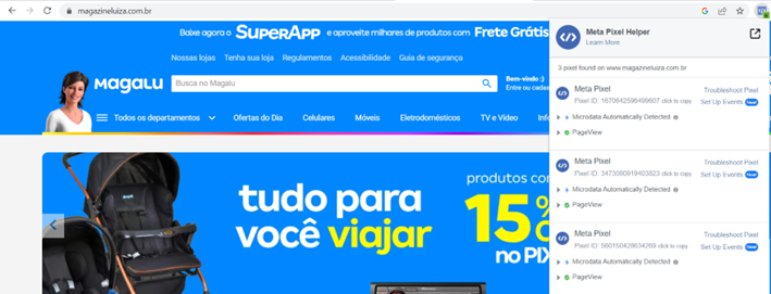 Agora acesse o site do Magazine Luiza dentro do Google Chrome e verá que lá tem alguns Pixels já em funcionamento. Quando estiver no site clique no ícone do quebra cabeça no lado da barra de navegação que se refere aos plugins do Chrome.