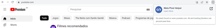 Agora vamos acessar um site que não tem Pixel rodando apenas para título de exemplo. Olhe como está no site do Youtube:
