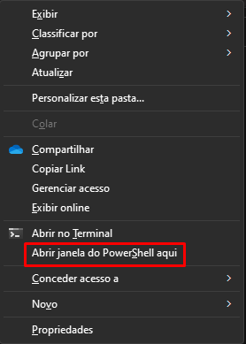 Para facilitar, clique com o botão direito segurando a tecla shift na pasta o arquivo foi salvo e selecione abrir janela do Power Shell aqui.