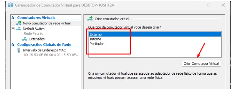 02 – Escolher o tipo de comutador que irá criar entre, externo, interno e particular, clicar em criar comutador virtual.