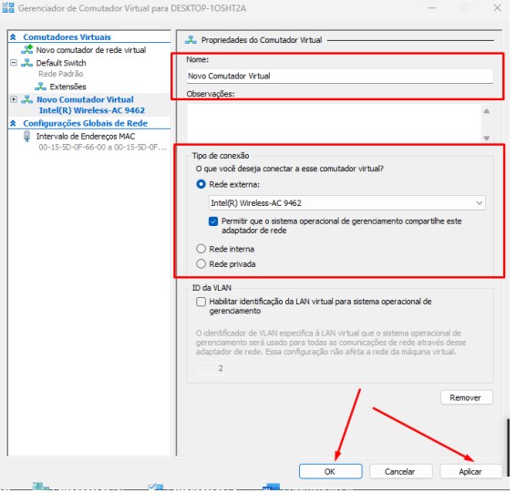 Lembrando que quando for criado um comutador de rede do tipo externo e interno, ele fará a