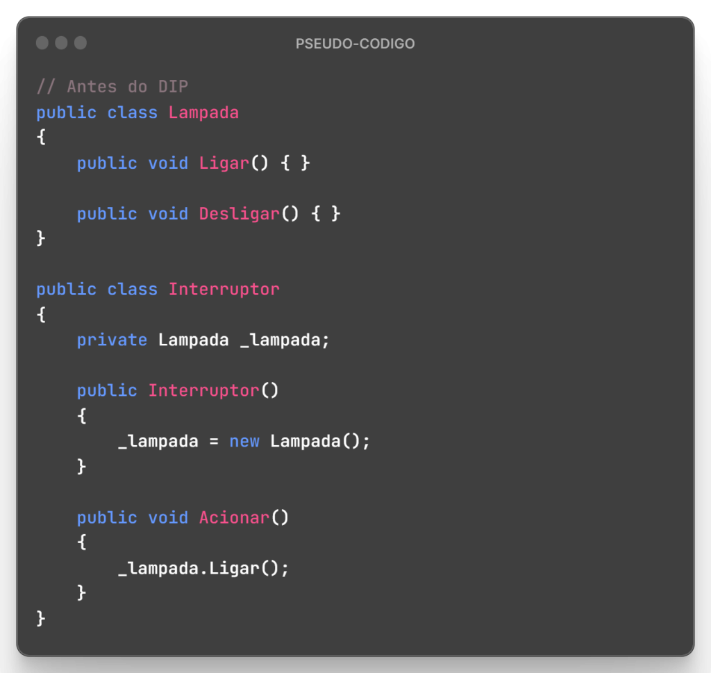 Aqui, a classe Interruptor depende diretamente da classe de baixo nível Lampada. Isso viola o DIP, pois a classe de alto nível está fortemente acoplada à implementação específica da classe de baixo nível.