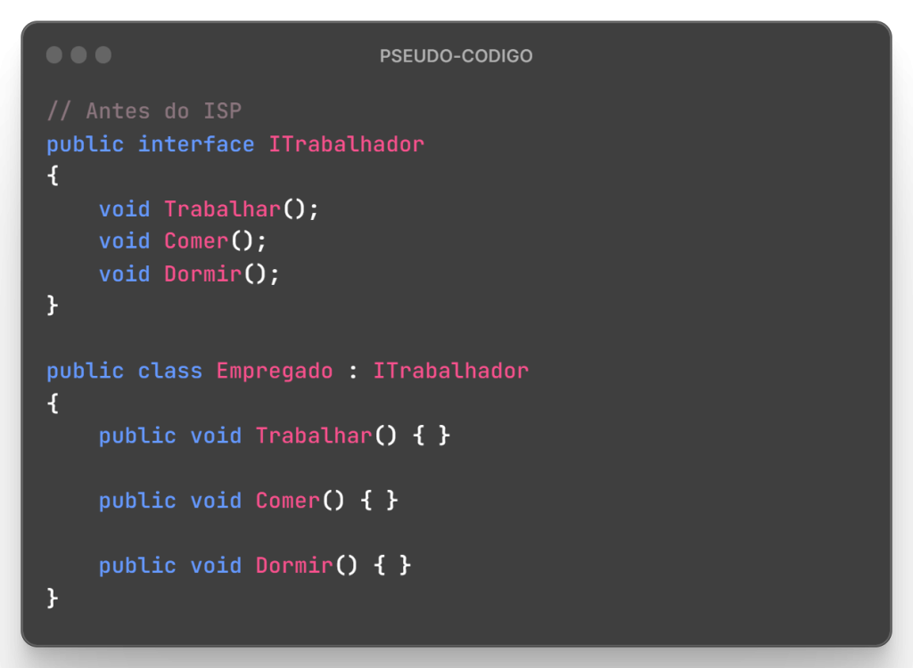 Neste exemplo, a interface ITrabalhador inclui métodos para trabalhar, comer e dormir. No entanto, isso pode ser problemático, pois nem todas as classes que implementam ITrabalhador podem precisar de todas essas funcionalidades.