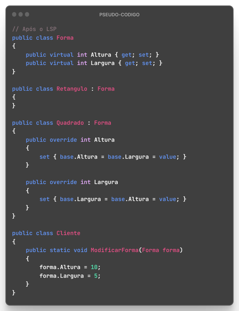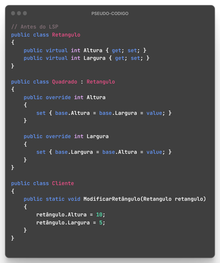 Aqui, temos um problema. Se passarmos um objeto da classe Quadrado para o método ModificarRetângulo, ele pode modificar as propriedades Altura e Largura de maneira que não seja consistente com um quadrado, violando assim o LSP.