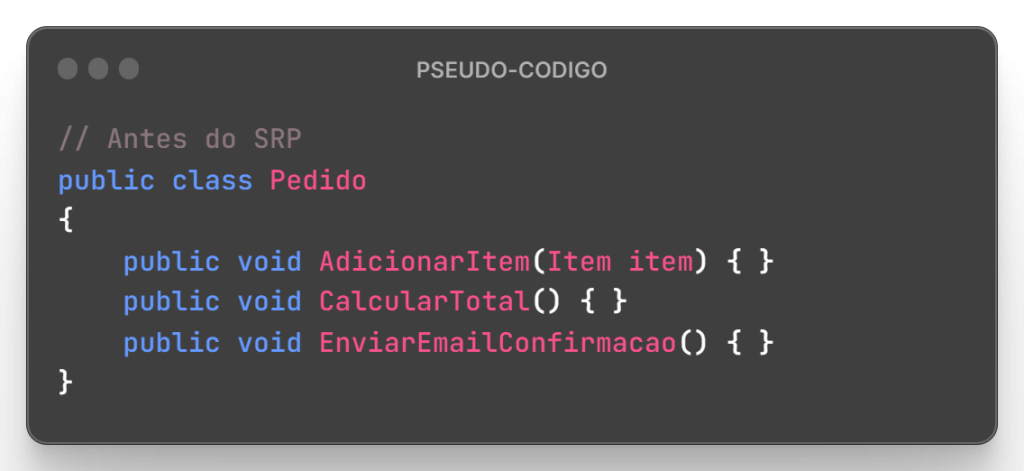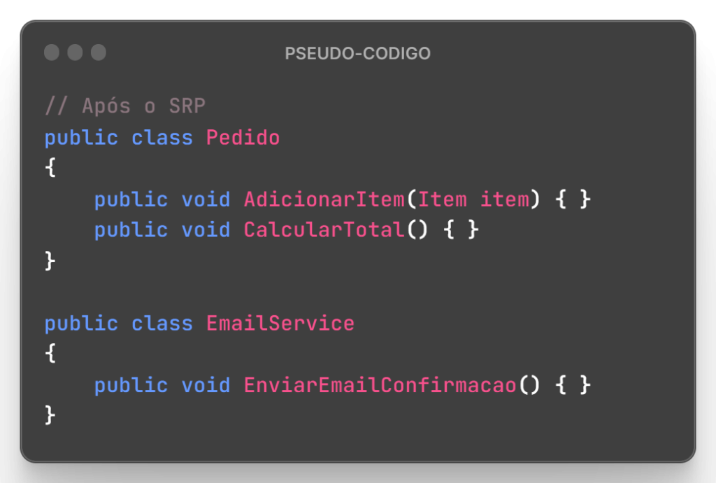 Neste caso, a classe Pedido tem a responsabilidade de lidar com a lógica do pedido e também de enviar e-mails de confirmação. Podemos aplicar o SRP dividindo essas responsabilidades em classes separadas: