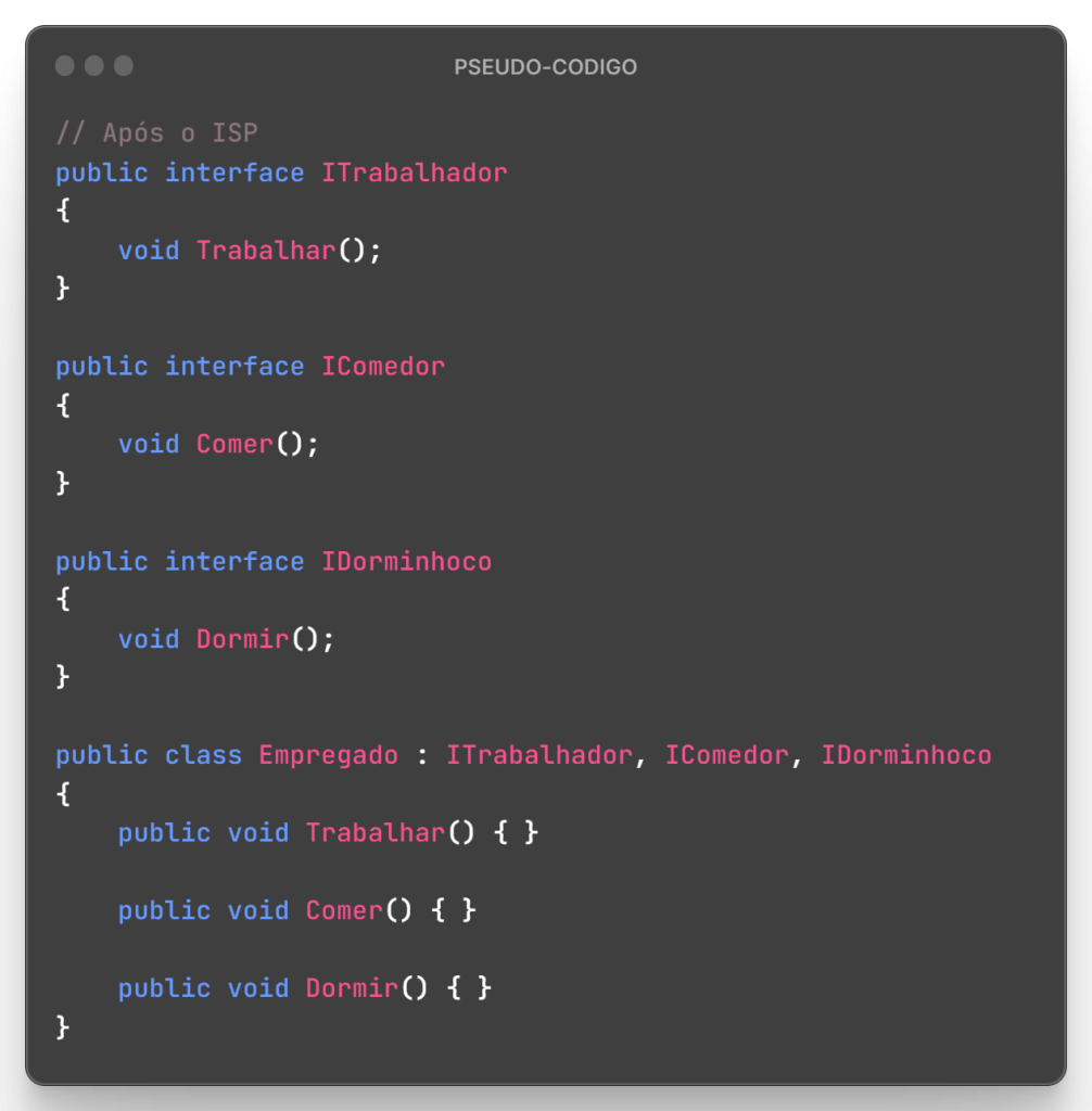 Aqui, as interfaces foram segregadas em ITrabalhador, IComedor e IDorminhoco. Agora, as classes podem implementar apenas as interfaces que são relevantes para elas. Isso evita que uma classe seja forçada a implementar métodos que não são necessários para sua funcionalidade, respeitando o Princípio da Segregação de Interfaces.