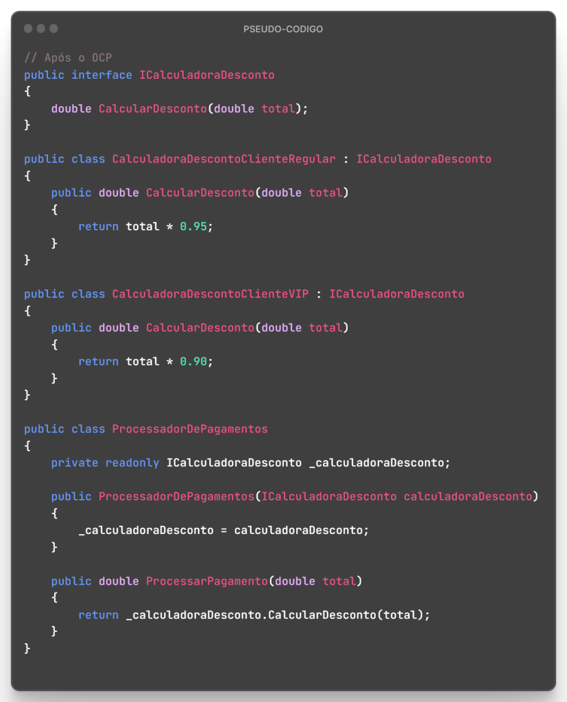 Agora, podemos adicionar novas implementações de ICalculadoraDesconto sem modificar a classe ProcessadorDePagamentos.