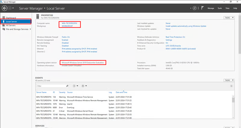 Neste exemplo vamos trabalhar com um servidor Windows Server 2019 Datacenter.
