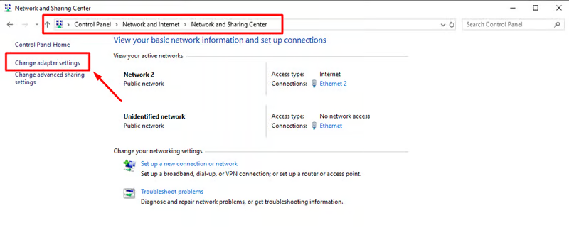 Primeiro passo, vamos até Control Panel > Network and Internet > Network and Sharing Center e clicar no menu Change adpter settings (localizado no menu lateral do lado esquerdo).