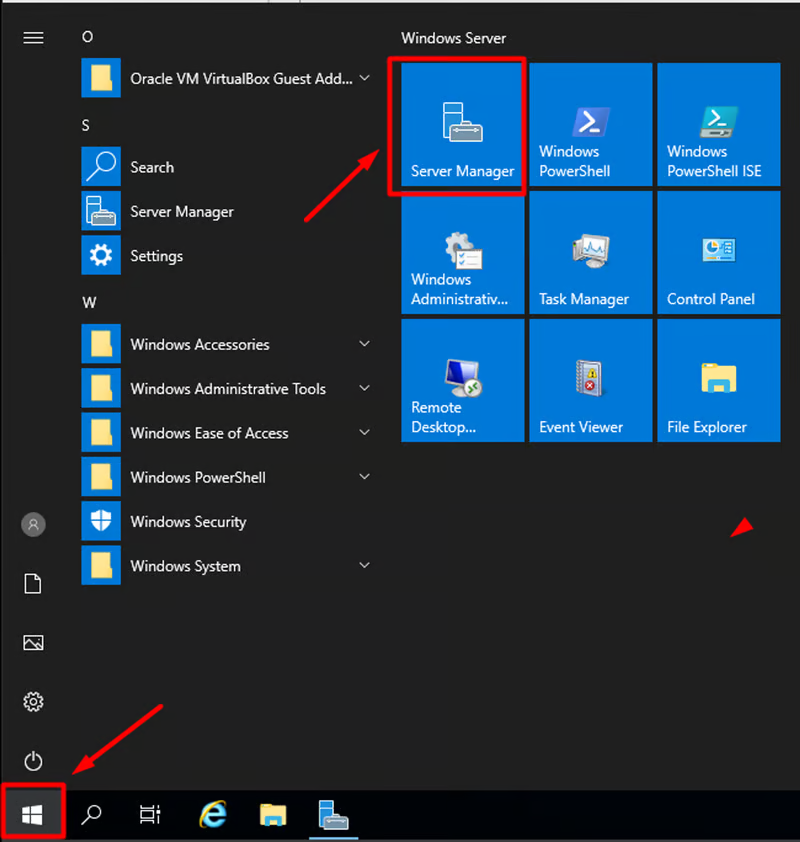 Abra o menu iniciar do Windows e selecione Server Manager ou digite pelo nome na barra de pesquisa.