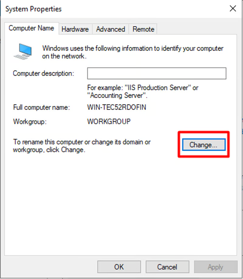 Quando abrir a janela de propriedades do sistema, clique no botão Change…