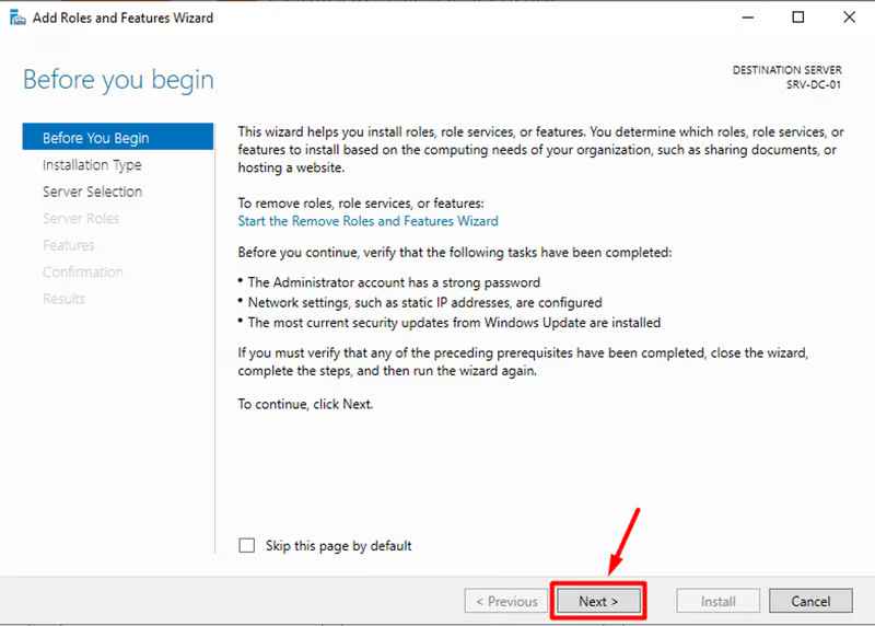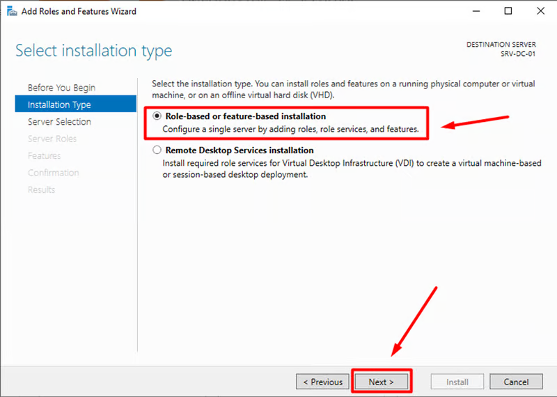 Deixe a opção Role-based or feature-based installation marcada e clique em Next.