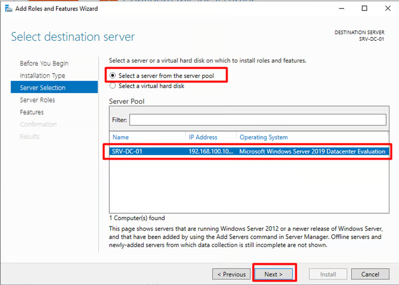 Deixe a opção Select a server from the server pool marcada e selecione o servidor que será instalado o recurso de AD (no meu caso será este mesmo servidor que configuramos). Depois clique em Next.
