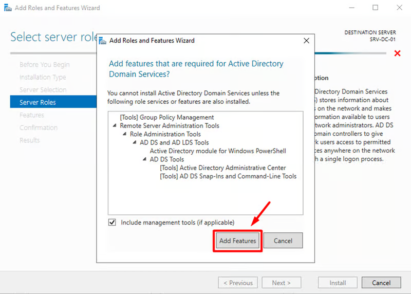Deixe a opção Include management tools (if applicable) marcada. Em seguida clique no botão Add Features.