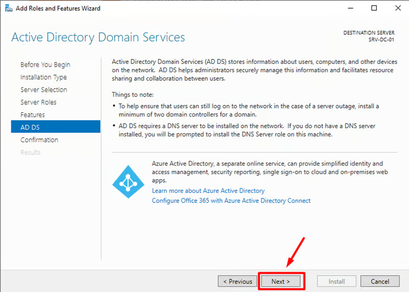 Nesta tela basicamente só explicando como funciona o Active Directory e também falando sobre o Azure Active Directory. Fique a vontade em ler todas as informações em em seguida clique em Next.