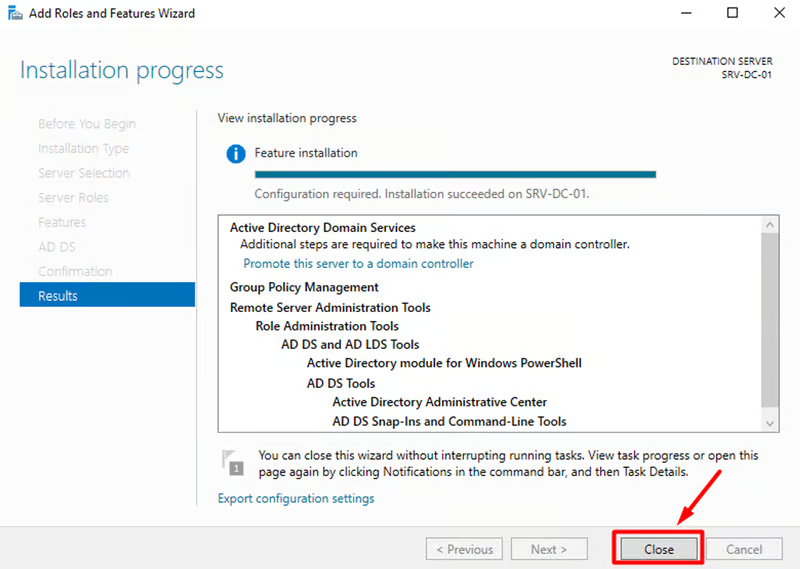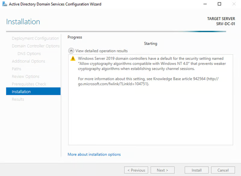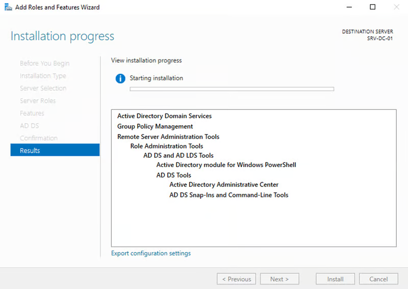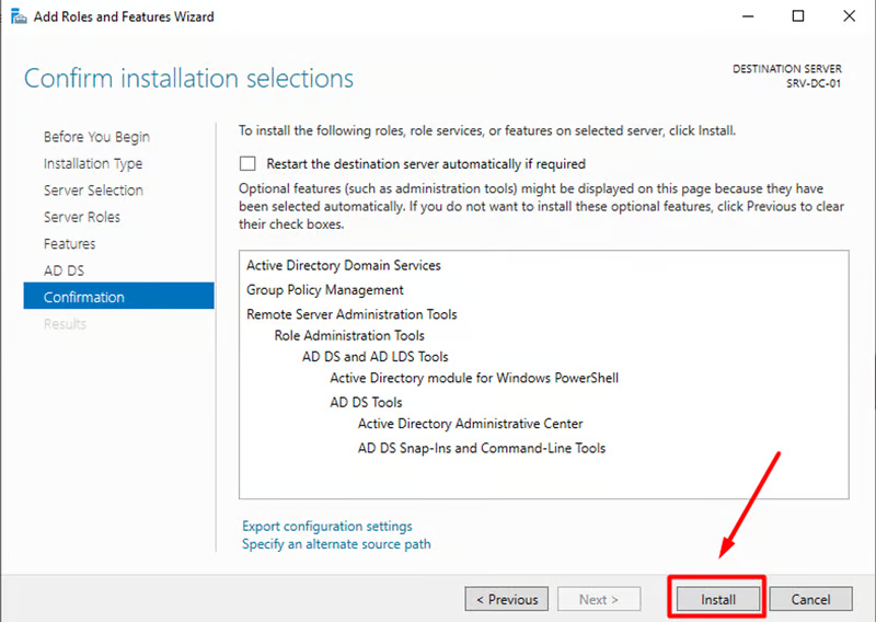 Agora basta clicar em Install para confirmar a instalação do Active Directory. Lembrando que não é necessário realizar o restart do servidor após a instalação da feature, mas se preferir, pode deixar a opção Restart the destination server automatically if required marcada.