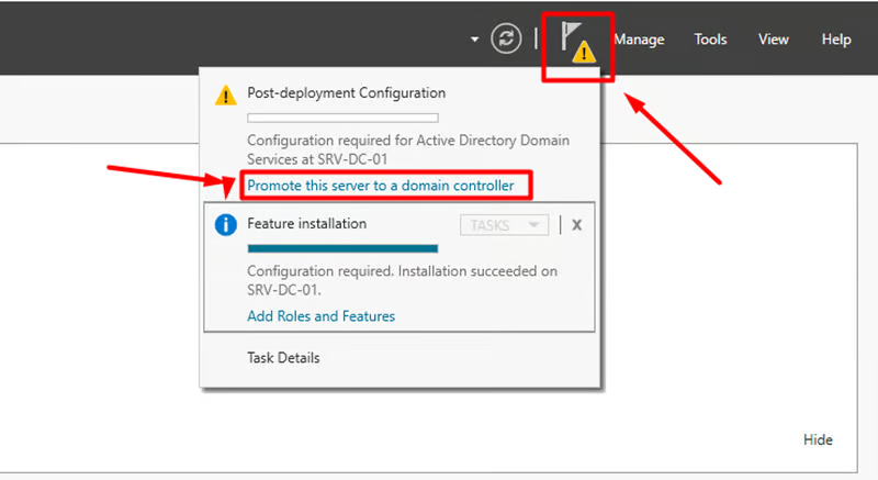 Após finalizar a instalação da feature, volte para a dashboard do Server Manager, clique no ícone de notificação e em seguida, clique em Promote this server to a domain controller para promover o servidor como Domain Controller (Controlador de Domínio)