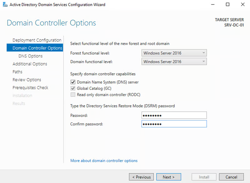 Relembrando! Como estou criando um servidor do zero e não tenho nenhum outro servidor domain controller, vou manter o nivel funcional da floresta como Windows Server 2016. Mas caso eu já tivesse um servidor DC principal rodando Windows Server 2012, por exemplo, eu mudaria o Forest functional level para Windows Server 2012.
