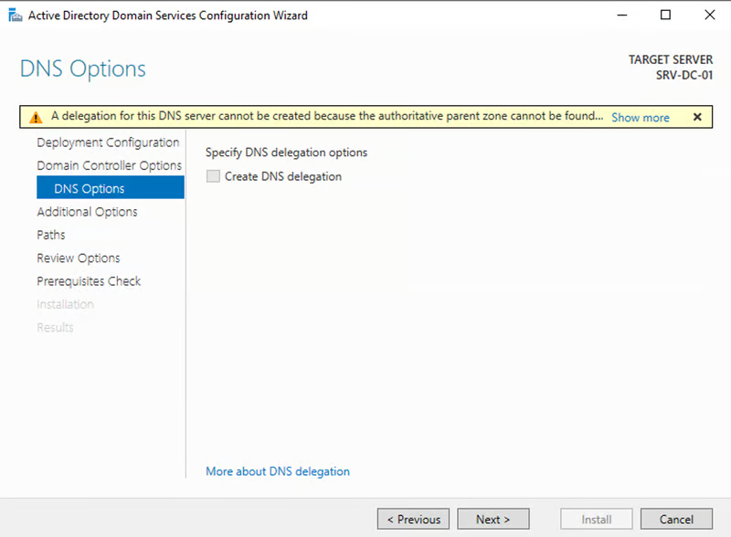 Será exibido essa mensagem de aviso devido não termos uma infraestrutura DNS existente. Nesta seção não precisa marcar nenhuma opção, somente clicar em Next.