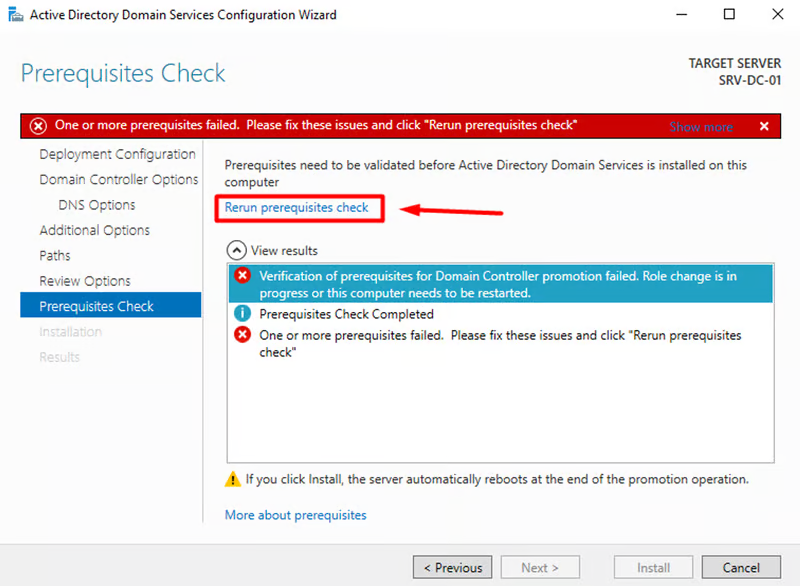 Como pode observar na imagem abaixo, ocorreu algumas falhas ao tentar promover este servidor como controlador de domínio. Mesmo clicando em Rerun prerequisites check, o erro permaneceu impedindo de finalizar as configuraçoes.
