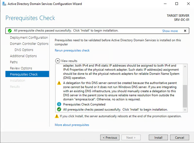 Após o reboot, refazemos todos os passos anteriores. Agora com Prerequisites Check Ok, clicamos em Install.