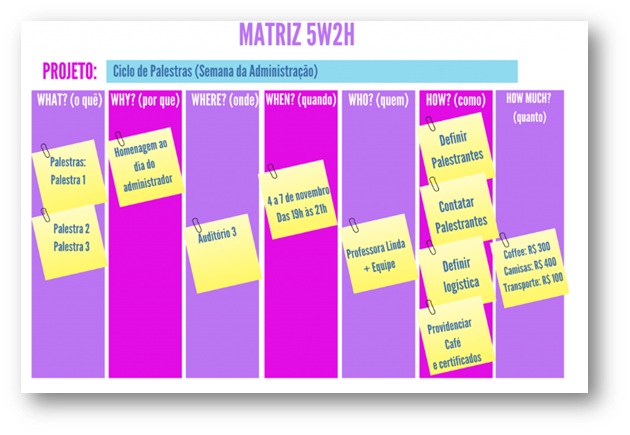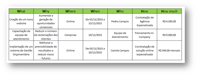 Segue 2 exemplos de matriz 5WH2. Um para a área de TI, e outro para a área de administração. Assim é possivel verificar como se aplica em cada área.