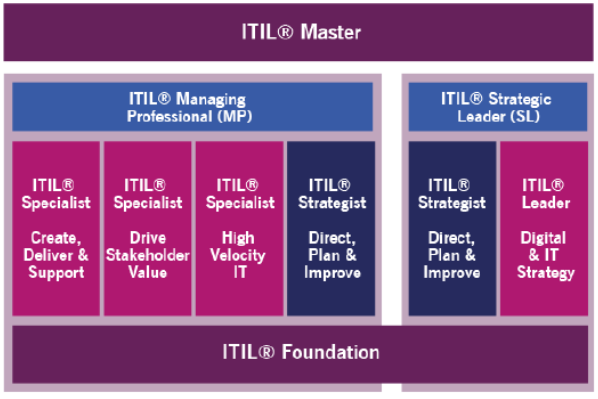 Agora se você olhou o topo do desenho e gostou do Master, saiba que você vai ter que estudar e muito. O Master nada mais é que a certificação mais valiosa do esquema da ITIL, o nível mais alto, são poucas pessoas no mundo que chegam nele, e para consegui-la, você precisa passar pelos caminhos MP e SL, ter pelo menos 5 anos de experiencia em gerenciamento de serviços de TI, com um cargo de liderança, e a parte mais difícil, você será testado em uma situação da sua escolha, onde a sua aprovação nesse teste conta como a experiencia prática que você precisa para esse exame.