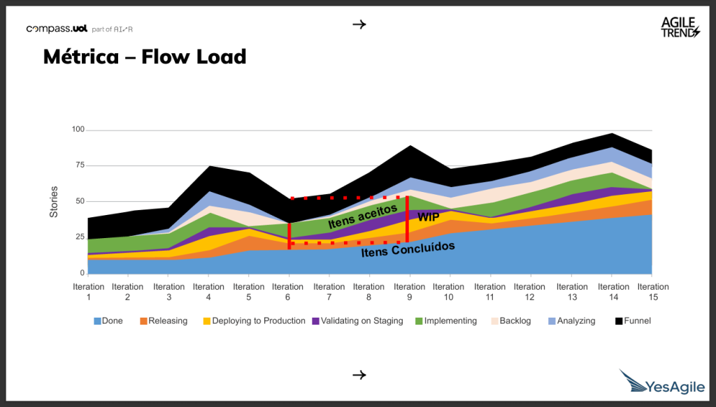 Flow Load – Mede quantos itens estão em andamento ao mesmo tempo. Aqui é onde as empresas caem na armadilha do “quanto mais coisa no WIP, mais rápido entrego”. Spoiler: não entrega. Só gera gargalo.