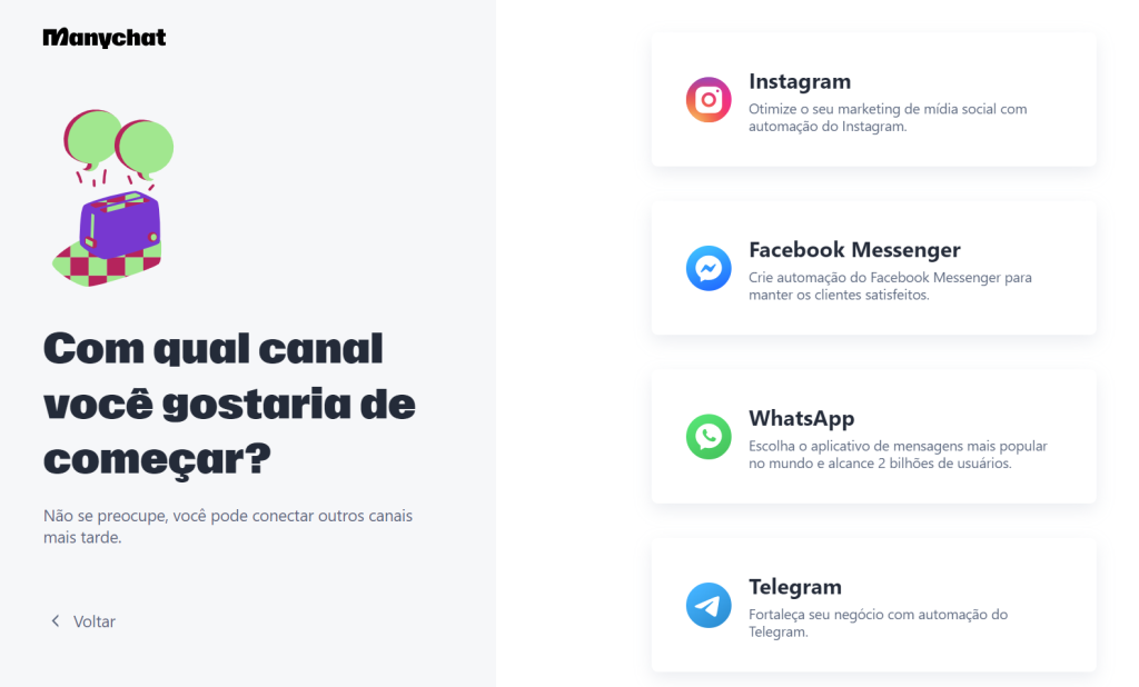 Etapa 4: Após fazer login, você será direcionado para o painel principal do ManyChat. Aqui, você verá várias opções de integração com diferentes plataformas de redes sociais (Instagram, facebook, whatsapp e telegram). Selecione a opção de sua preferência e aperte em conectar.