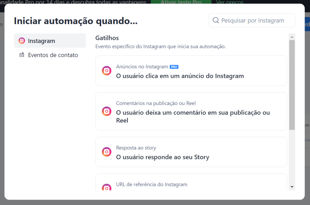 Etapa 8: Escolha a opção desejada de acordo com o seu objetivo final, neste exemplo utilizaremos o “Comentários na publicação ou Reel”.